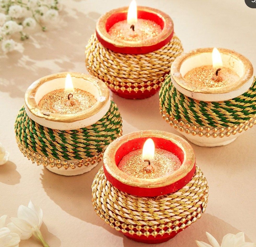 Traditional Decorative Diya with Cowrie Shells | Handmade Tealight Candle Holder for Diwali (Pack of 4)