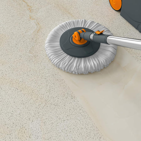 - 360° Rotating Spin Mop Handle : This lightweight, adjustable stainless-steel handle rotates 360° for maximum flexibility. Clean tight spots and hard-to-reach corners, like under tables and beds, without bending or straining.