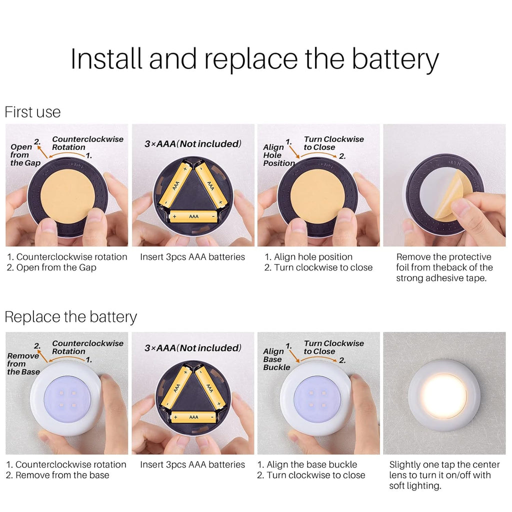 Brighten any space instantly with these push tap LED puck lights! Compact and portable, they provide warm white lighting with just a touch. Perfect for bedrooms, cabinets, closets, or as mini night lamps. Comes in a handy pack of 5.
