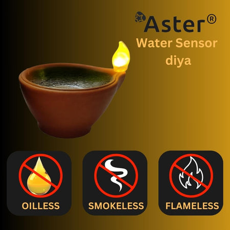 - 🎆 Realistic Flame-Like Glow: The Aster Water Sensor Diya replicates the charm of a real diya, creating a warm and inviting ambiance that captures the true spirit of Diwali.